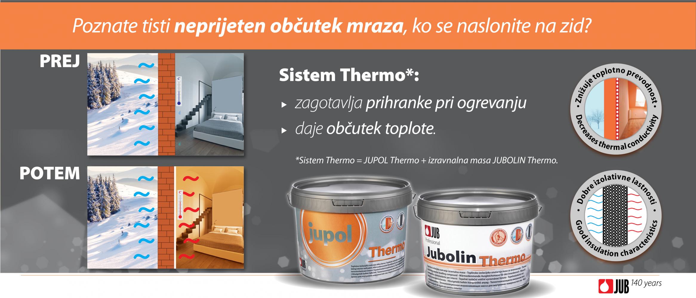 Nova termoizolacijska notranja barva JUPOL Thermo z izravnalno maso JUBOLIN Thermo učinkovito preprečuje izgube toplote skozi tiste zidne površine, ki so slabo izolirane ali pa so zaradi svoje severne lege v bivanjskih objektih bolj izpostavljene vlagi. Poleg omenjenega sistem Thermo zmanjša porabo energije za ogrevanje prostorov, kar po izračunih pri povprečni enodružinski hiši s fasadno površino 200 m2 na letnem nivoju pomeni kar 400 kg manj izpustov CO2 plina in prihranek v višini 85 evrov za ogrevanje. Zaradi visoke kakovosti Thermo izravnalne mase, ki se odlično oprime na betonsko podlago, bo življenjska doba zidov s temi nanosi sorazmerno daljša, barva JUPOL Thermo pa omogoča čiščenje manjših madežev na površini in s tem dalj časa ohranja lepši videz površin. Zidovi bodo po nanosu sistema toplejši tudi na otip, bivanje v prostorih bo prijetnejše, uporabniki pa bodo prihranili tudi pri stroških za njihovo ogrevanje pozimi ali hlajenje poleti. Zaradi preprečevanja nastanka plesni brez uporabe biocidov je negativen vpliv na okolje zmanjšan, poleg tega je tovrstna funkcijska zaščita dolgotrajnejša kot zaščita s kemičnimi sredstvi. Sistem Thermo je namenjen tudi tistim uporabnikom, ki si ne morejo privoščiti naložbe v novo fasado, pa bi vseeno radi izboljšali energijsko učinkovitost objekta, v katerem bivajo, hkrati pa bo dobrodošla rešitev tudi za slabo ali povsem neizolirane spomeniško zaščitene objekte, pri katerih zakonodaja ne dovoljuje sprememb zunanjega videza stavb.